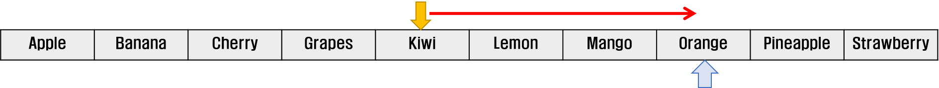 이 방법도 생각할 수 있다. 사전의 중간(Kiwi)을 펼쳐놓고 Orange의 위치는 이보다 뒤이므로 나머지 뒷부분에서 중간을 펼치고... 를 반복해 Orange를 찾는 방법이다.
