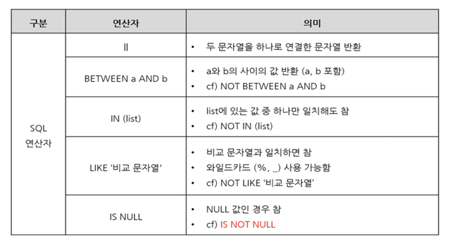 - NULL은 비교 연산자 사용 불가 (모두 NULL로 출력됨)