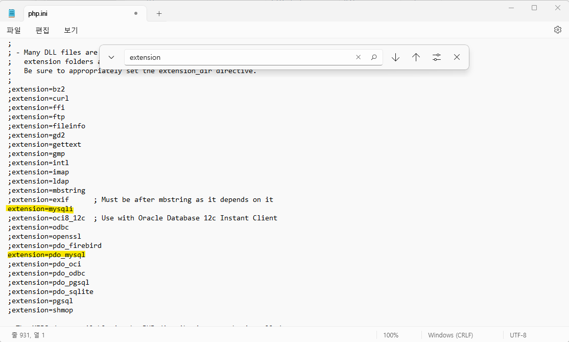 마지막으로 ;extention=mysqli와 ;extention=pdo_mysql을 찾아 세미콜론을 지워주고 저장해줍니다. 저장 후 php.ini 파일을 C 드라이브 - Windows에 옮겨줍니다.