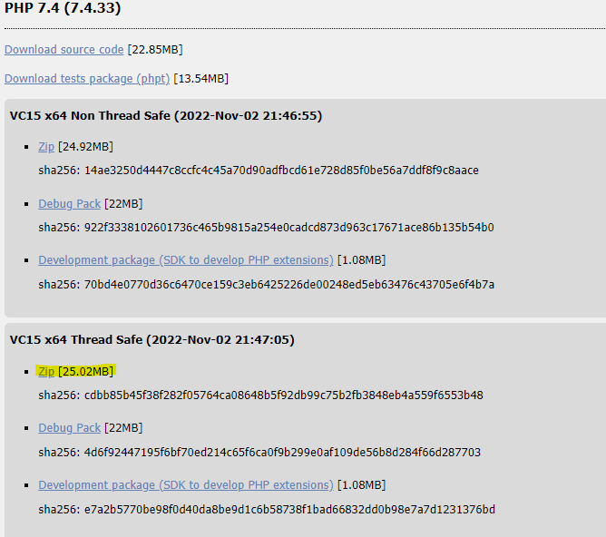 PHP 8.0 (8.0.28) Download source code [23.47MB] Download tests package (phpt) [13.56MB] VS16 x64 Non Thread Safe (2023-Feb-14 12:39:52) Zip [25.53MB] sha256: 6bcd82934073488cc451f2f1658feedeb43ef5077e9ae7bcf354ae5c8ec69b4a Debug Pack [23.21MB] sha256: a147