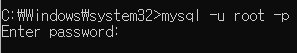 명령 프롬프트로 돌아와서 mysql -u root -p를 입력해줍니다. 그러면 아래와 같이 패스워드를 입력하라고 나옵니다.