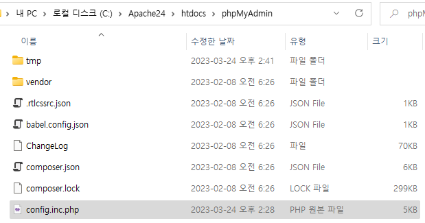 phpMyAdmin 폴더 안에 있는 config.sample.inc.php 파일의 이름을 config.inc.php로 바꿔줍니다.