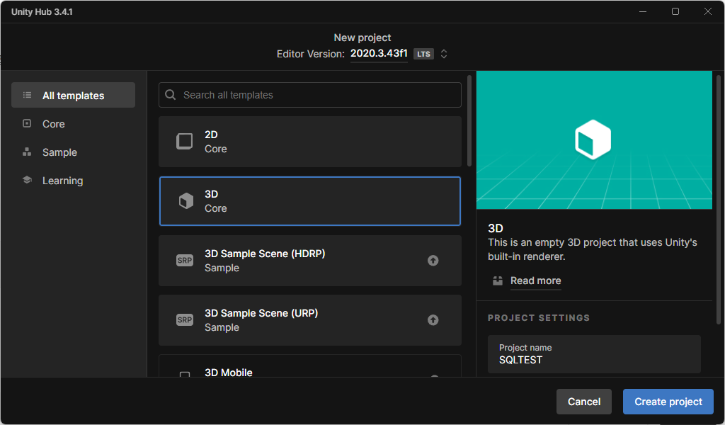 3D 템플릿으로 새로운 프로젝트를 하나 생성해줍니다.