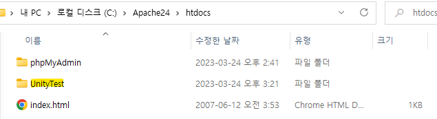 이제 유니티와 DB를 서로 연결시켜보겠습니다. 우선, php 스크립트를 작성합니다. C 드라이브 - Apache24 - htdocs 폴더에 새로운 폴더를 만듭니다. 이름은 UnityTest로 하겠습니다.