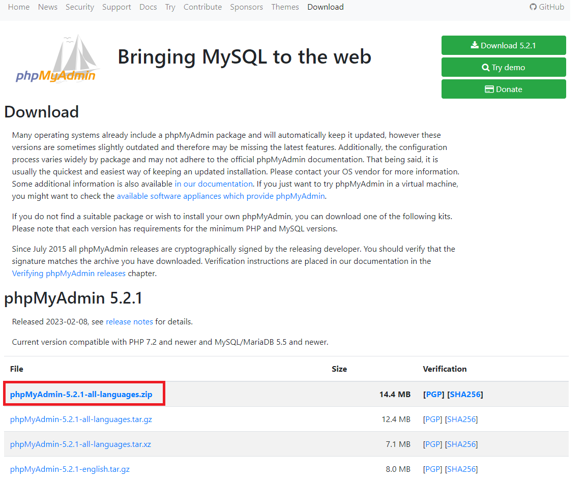 위 사이트로 가서 phpMyAdmin을 설치해줍니다(작성 기준 5.2.1 버전). phpMyAdmin-5.2.1-all-languages.zip 파일을 받아줍니다.