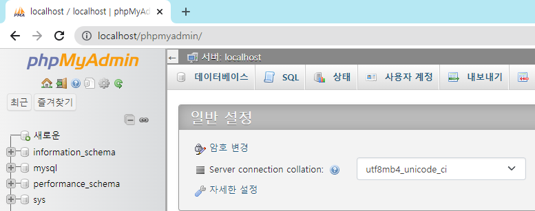 위 과정이 모두 끝나면, 인터넷 주소에 localhost/phpMyAdmin을 입력했을 때, root로 로그인을 하면 다음과 같은 화면이 나옵니다.