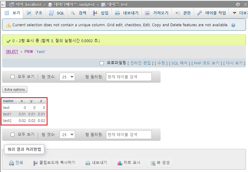 씬을 시작해서 버튼을 눌러봅니다. phpmyadmin 창에서 값이 저장되는지를 확인합니다. 저장될 값을 바꿔가면서 값들이 저장되는지도 확인해봅니다.