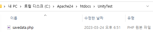 UnityTest 폴더 안에 savedata.php라는 파일을 만들어줍니다. 메모장으로 스크립트를 먼저 작성하시고, 이름을 수정해주셔도 됩니다. 스크립트는 아래와 같습니다.