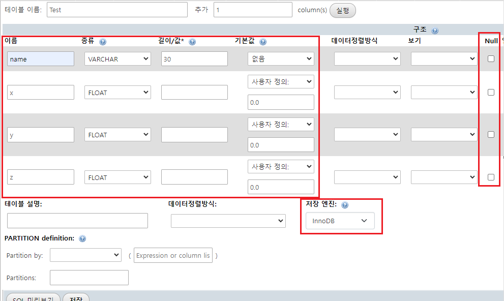 설정이 끝나면 저장을 눌러 테이블 생성을 완료합니다.