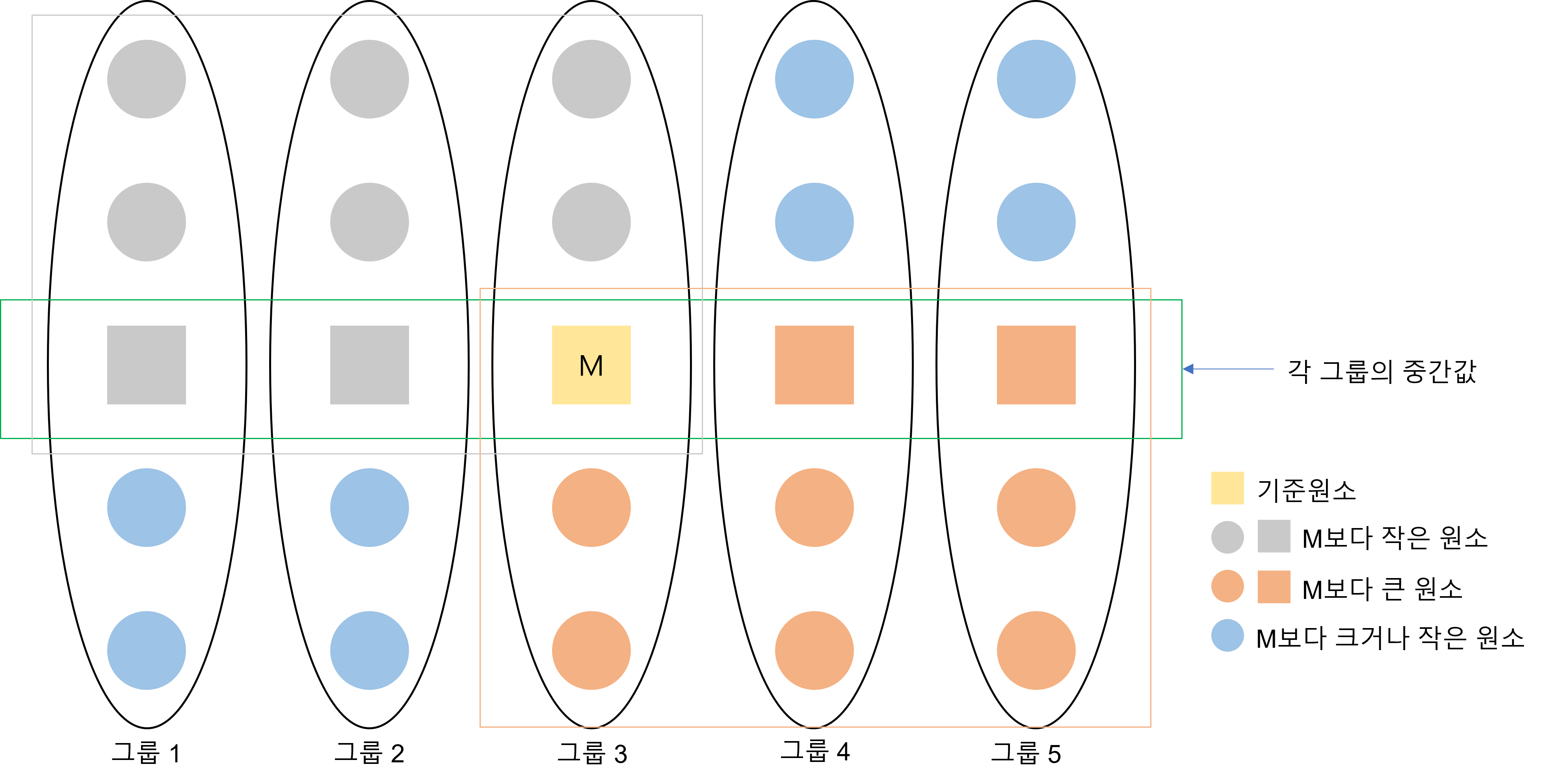 // 전체 원소를 5개씩의 원소를 가진 ceil(n/5)개의 그룹으로 나눈다.