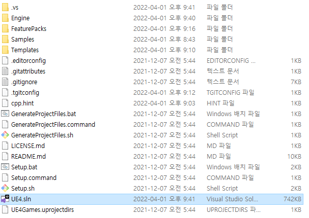 그럼 프로젝트를 만든 폴더를 가면 여러 폴더들과 프로젝트명.uproject 파일, 솔루션 파일(프로젝트명.sln)이 하나 만들어져 있습니다. 만약 없다면 당황하지 마시고 uproject 파일을 우클릭해서 Generate Visual Studio project files를 눌러주세요.