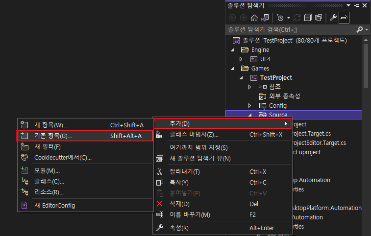 이 작업이 끝나셨다면 프로젝트 폴더로 다시 돌아가셔서 솔루션 파일을 실행시켜 비주얼 스튜디오를 켜주세요. 그러신 다음 아래 그림을 참고하셔서 새로 만든 소스 파일을 불러와주세요.