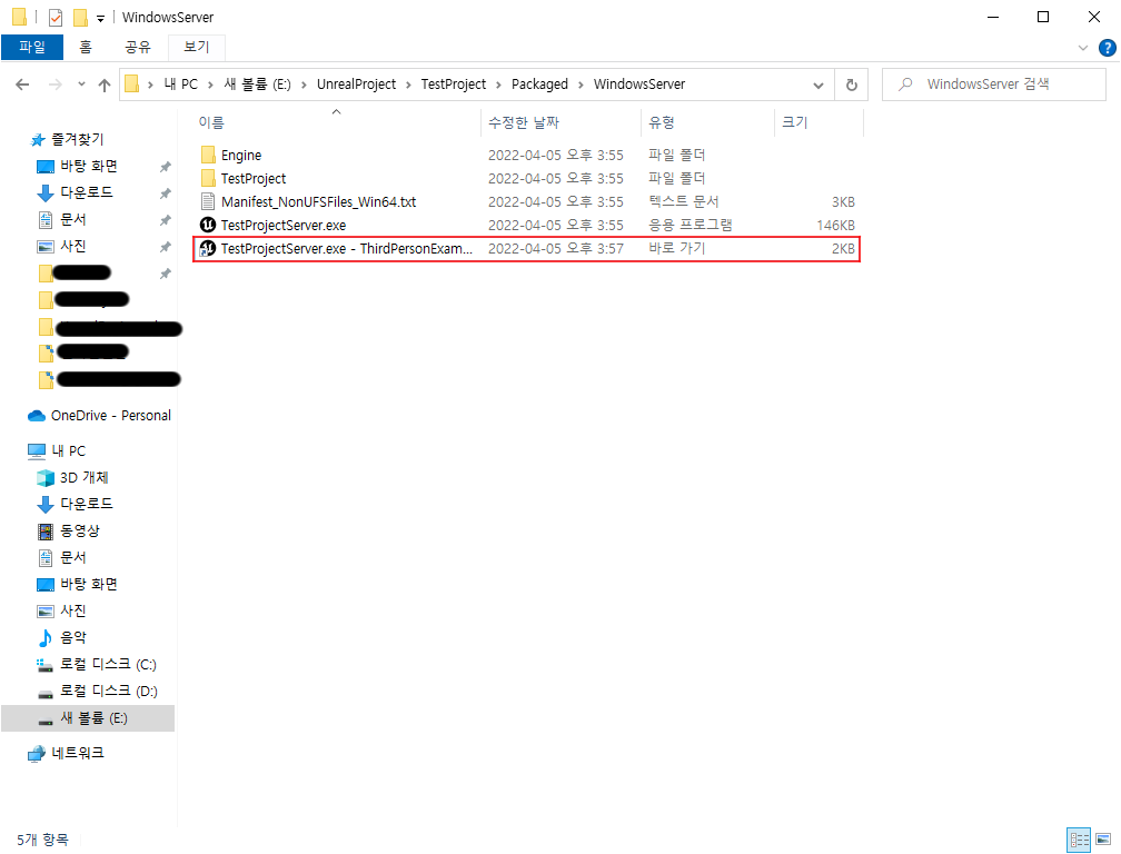 Packaged 폴더에 WindowsServer와 WindowsNoEditor 폴더가 생겼다면 성공입니다. 이제 서버를 열어볼 차례입니다. WindowsServer로 들어가주세요. 프로젝트명Server.exe 파일 바로 가기를 만들어서 이름의 바로 가기 부분을 ThirdPersonExampleMap으로 바꿔주세요.