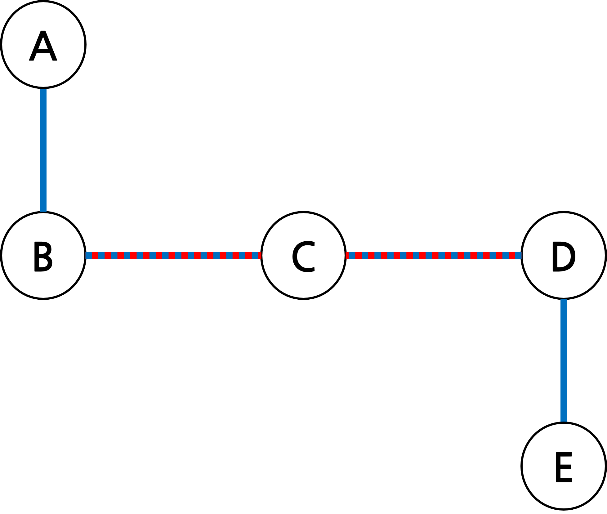 A에서 E로의 통신이 필요합니다. 그러면, A에서 송신할 데이터를 패킷으로 쪼개어 B로 보냅니다. B는 이 패킷들을 받고 목적지인 E에 가까운 노드인 C로 보내게됩니다. C는 다시 D로, D는 E로 보내는 방식으로 진행됩니다. 이 때, B에서 D로의 통신이 필요하다면 마찬가지의 과정으로 B가 패킷을 C에게, C가 D에게 보냅니다. 중요한 점은, 회선이 사용 중이라고 통신이 되지 않는 것이 아니라는 것입니다.